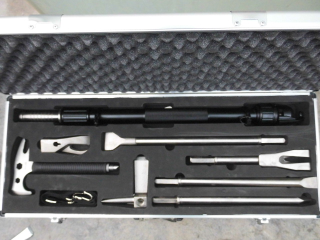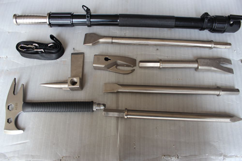 产品结构: 本产品由伸缩冲击臂、宽錾刀、窄錾刀、尖凿、撬皮器、破锁拔钉器、十字头、消防腰斧、接杆组成 |