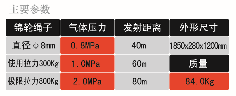 标准配置:抛揽器主体一套,直径为8mm引揽绳40米,抛头1件;