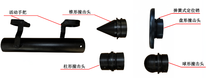 撞门锤由锤体、可拆卸式撞击头、活动手把组成。通过连接体可把两个锤体连在一起,实现两人或多人操作。